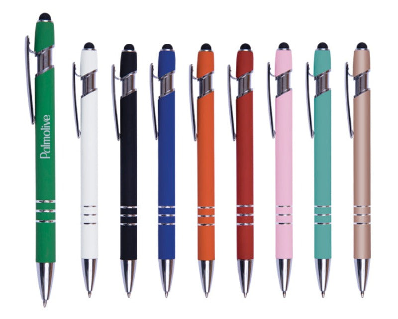 Bolígrafo de aluminio con recubrimiento de goma. Con detalles y clip metálico. Punta touch y mecanismo de click.