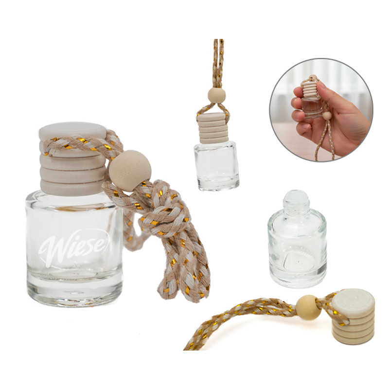 Botella difusora de vidrio de 5 ml. para aceites aromáticos o fragancias, la tapa de madera se impregna y desprende el aroma contenido. Ideal para coches, closets o lugares pequeños. Cuenta con cinta ajustable para colgarse. NO incluye fragancia.
