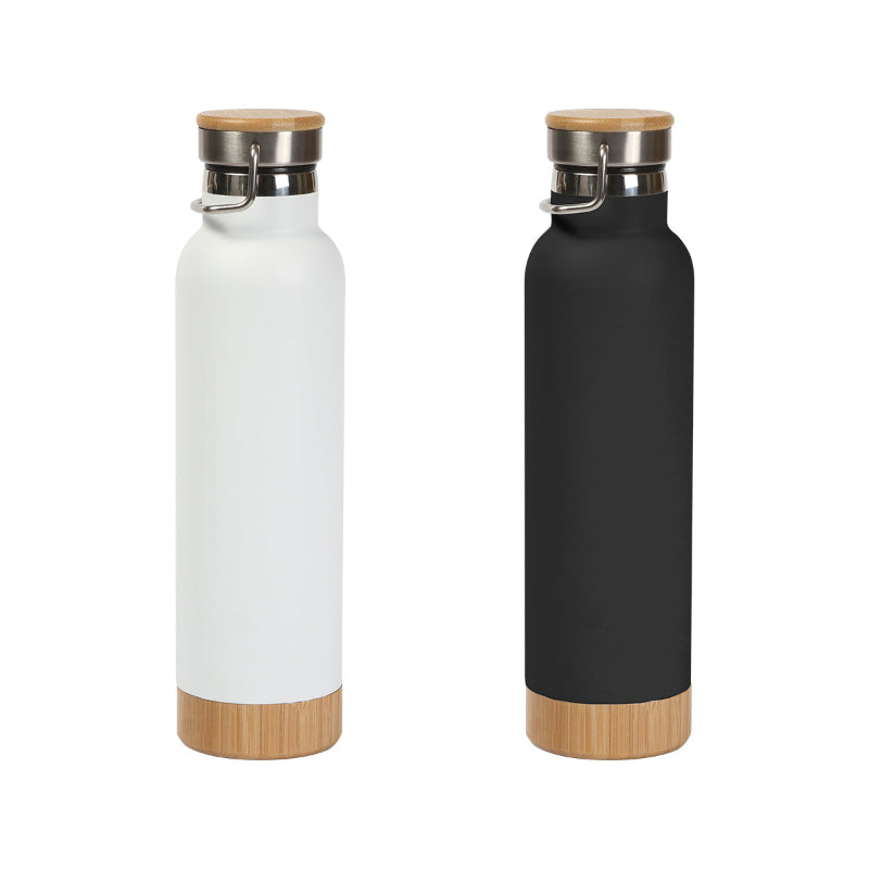 Botella con asa fabricada en acero inoxidable reciclado doble pared con tapa de rosca fabricada en bambú, detalles en la base del mismo material. Capacidad de 600 ml, es una opción sostenible y elegante para mantener tus bebidas frías o calientes mientras contribuyes al cuidado del medio ambiente, incluye caja individual.