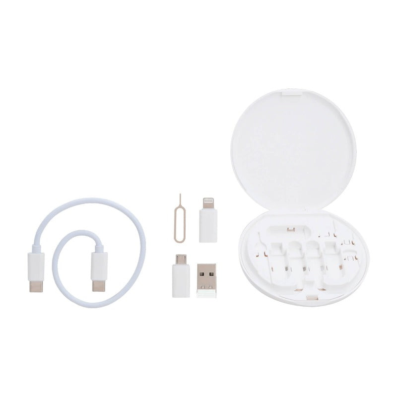 Caja de almacenamiento de plástico con cables adaptadores y soporte para celular que incluye; 1 tipo USB, 1 tipo C, 1 lightning, 1 Micro, 1 llave Sim y 3 espacios para Micro/ Nano Sim.