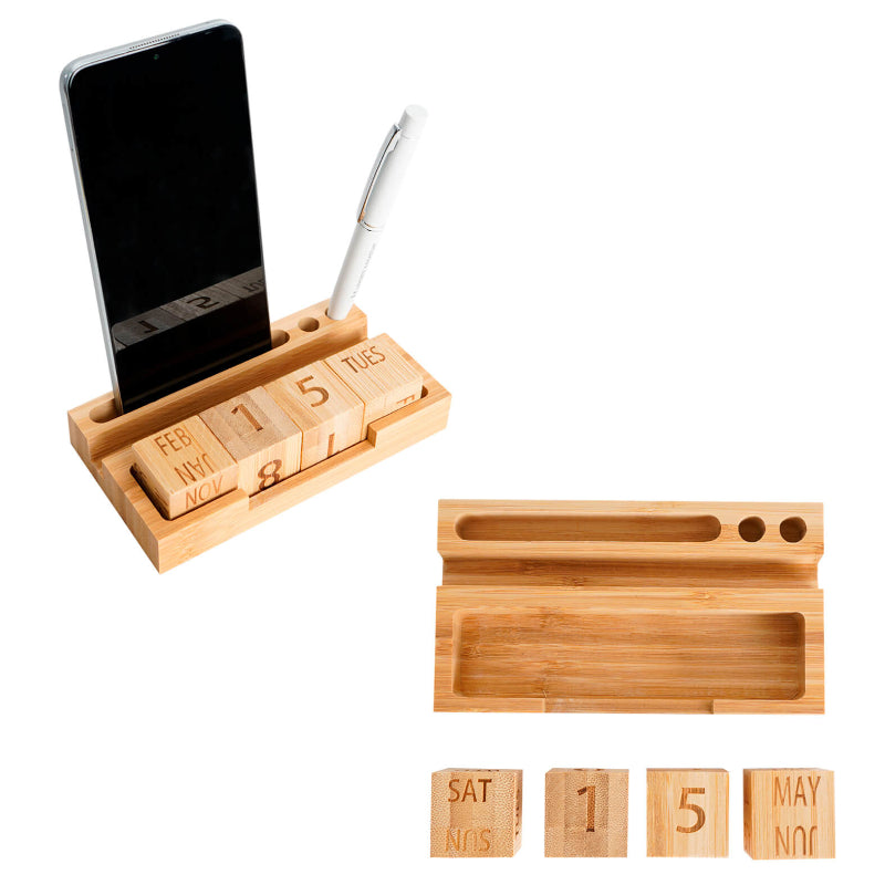 Organizador de escritorio de bambú con calendario perpetuo, los cubos giratorios permiten ajustar el día, mes y fecha de manera manual. Además, cuenta con espacio para bolígrafos y funciona como soporte para celular.