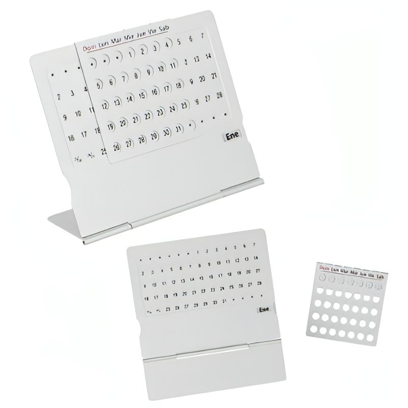 Mini calendario con base, rejilla movible y ruleta de aluminio para modificar los días y meses del año.