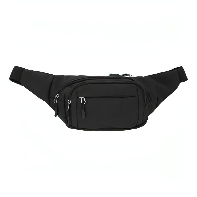 Cangurera de poliéster con 4 compartimentos, cierres impermeables, cinta ajustable a la cintura y broche de seguridad a presión.