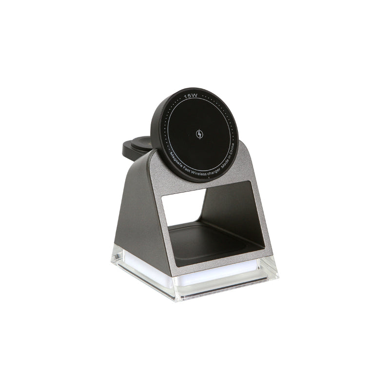Cargador wireless magnético de 15 w, para celular, smartwatch y airpods, forma triangulo piramidal, acabado de lujo con pintura esmaltada, base de cristal resistente que además cuenta con función de lampara nocturna, cuenta con dos tipos de luz (cálida y blanca).