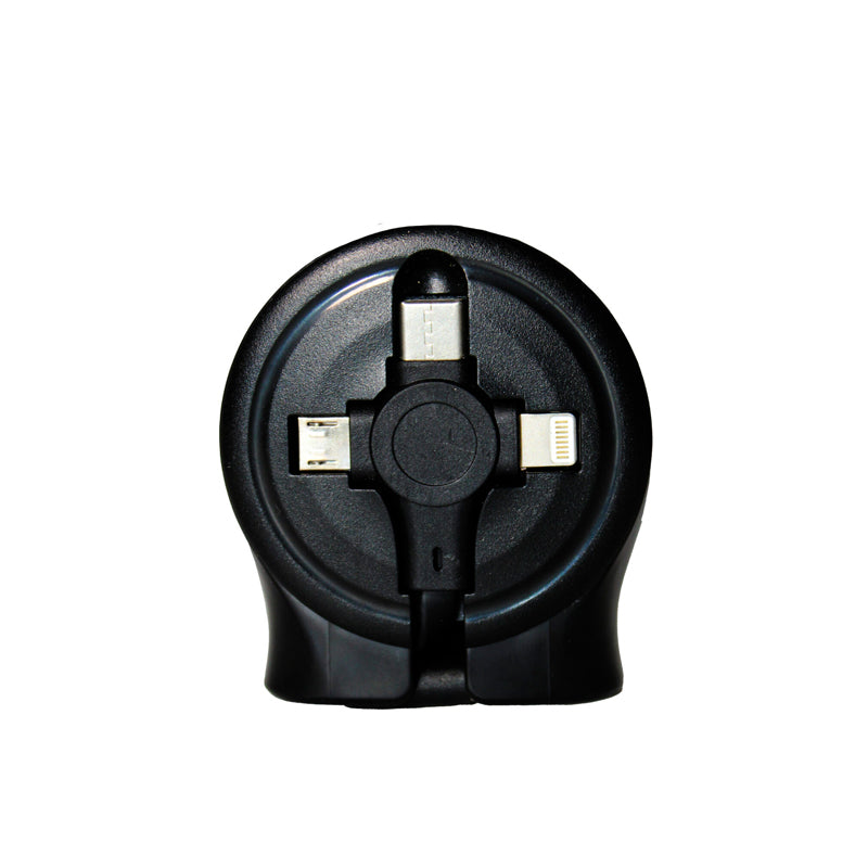 Cargador “Telescopio” 3 en 1 con cables retráctiles: micro USB, USB tipo C y Lightning.