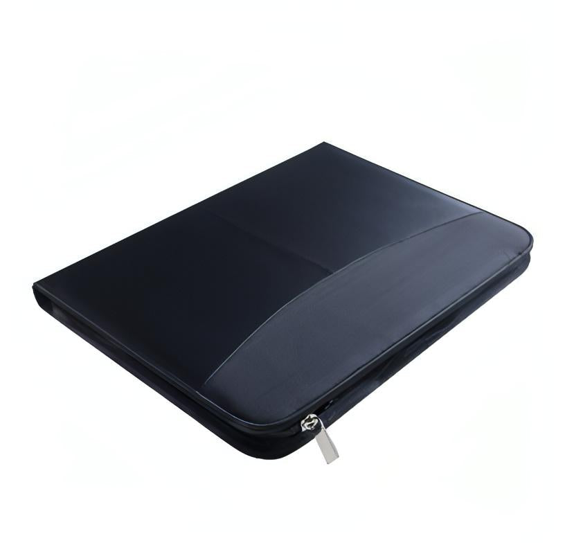 Carpeta de curpiel tamaño carta con cierre, block de raya con 30 hojas, compartimiento para tarjetas y porta bolígrafo.