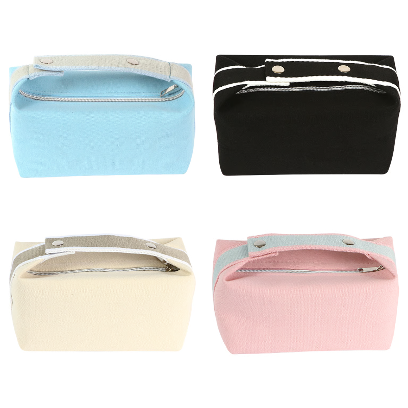 Bolsa cosmetiquera fabricada en tela de algodón tipo canvas y poliéster, su forro es 100% poliéster. Cuenta con un compartimento principal con cierre de metal, incluye una agarradera superior con broches a presión para poder ajustarla. Diseño práctico y elegante que ayuda a organizar y transportar los productos de belleza de manera cómoda y segura.
