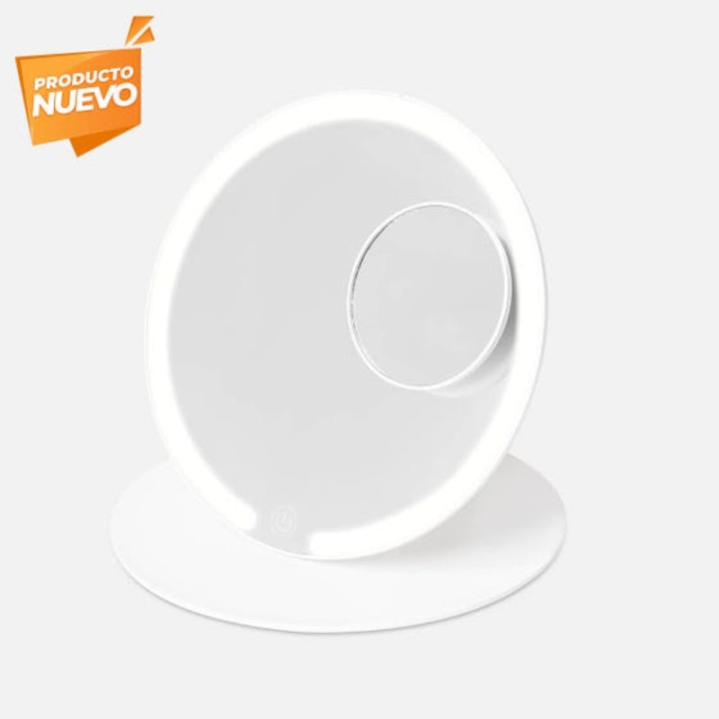 Espejo plegable con iluminación LED con 3 modos de luz: fría, natural y cálida. Pulsando el botón del sensor táctil one touch. Duración de luz de 3.5 hrs. Incluye espejo magnético de aumento 5x, puerto de carga y cable tipo C.
