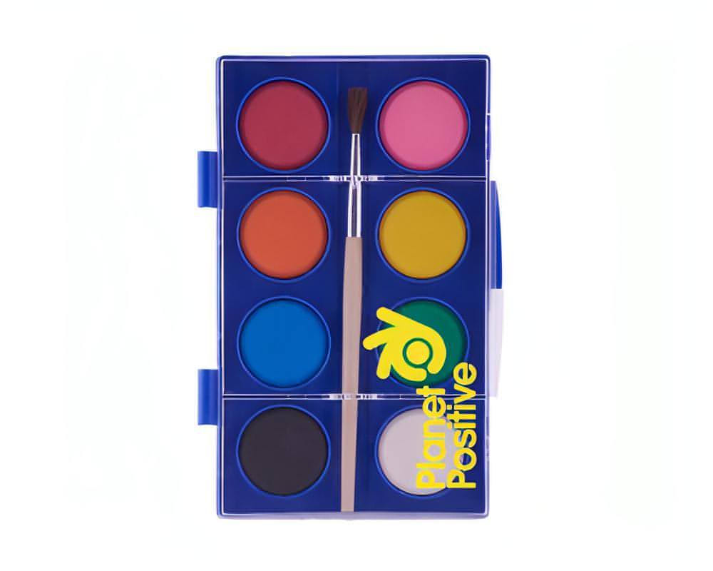 Estuche de 8 acuarelas no tóxicas para utilizarse en cartón, papel, o tela. Un promocional divertido y educativo. Se diluyen con agua para su aplicación. Incluye un pincel. Presentación: caja en color blanco.