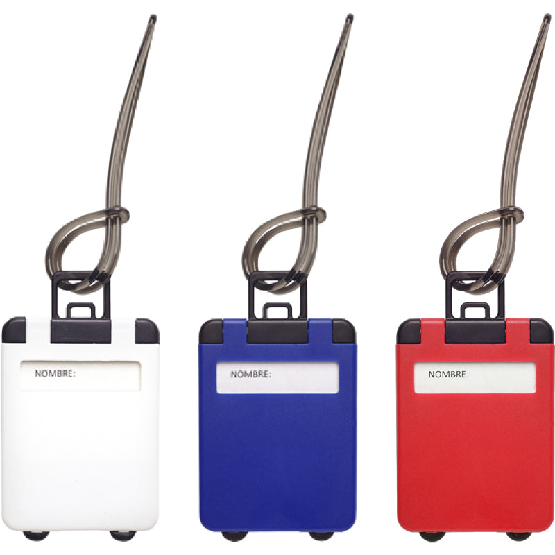 Identificador en forma de valija / maleta. Cuenta con etiqueta para datos personales. Lazo de plástico para colgar en la manija del equipaje.