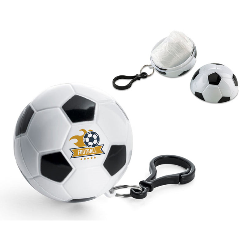 Impermeable con estuche portátil en forma de balón de fútbol y gancho para sujetar.