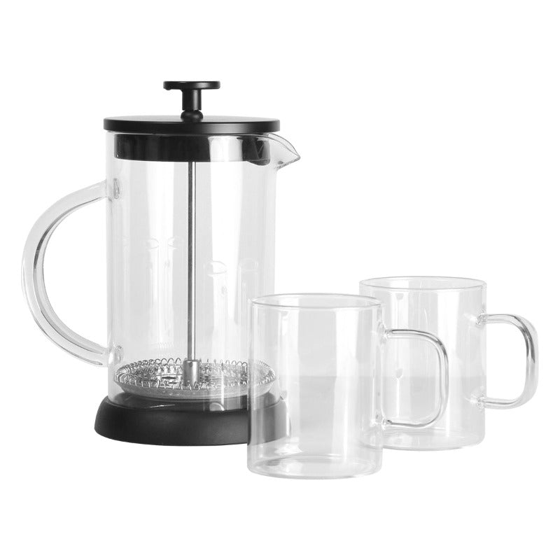 Juego de prensa francesa con 2 tazas de cristal, fabricado en vidrio de borosilicato, con tapa de acero inoxidable y plástico, émbolo de acero inoxidable y base de TPR, capacidad de prensa de 600 ml, tazas de 230 ml. Incluye caja de cartón por set.