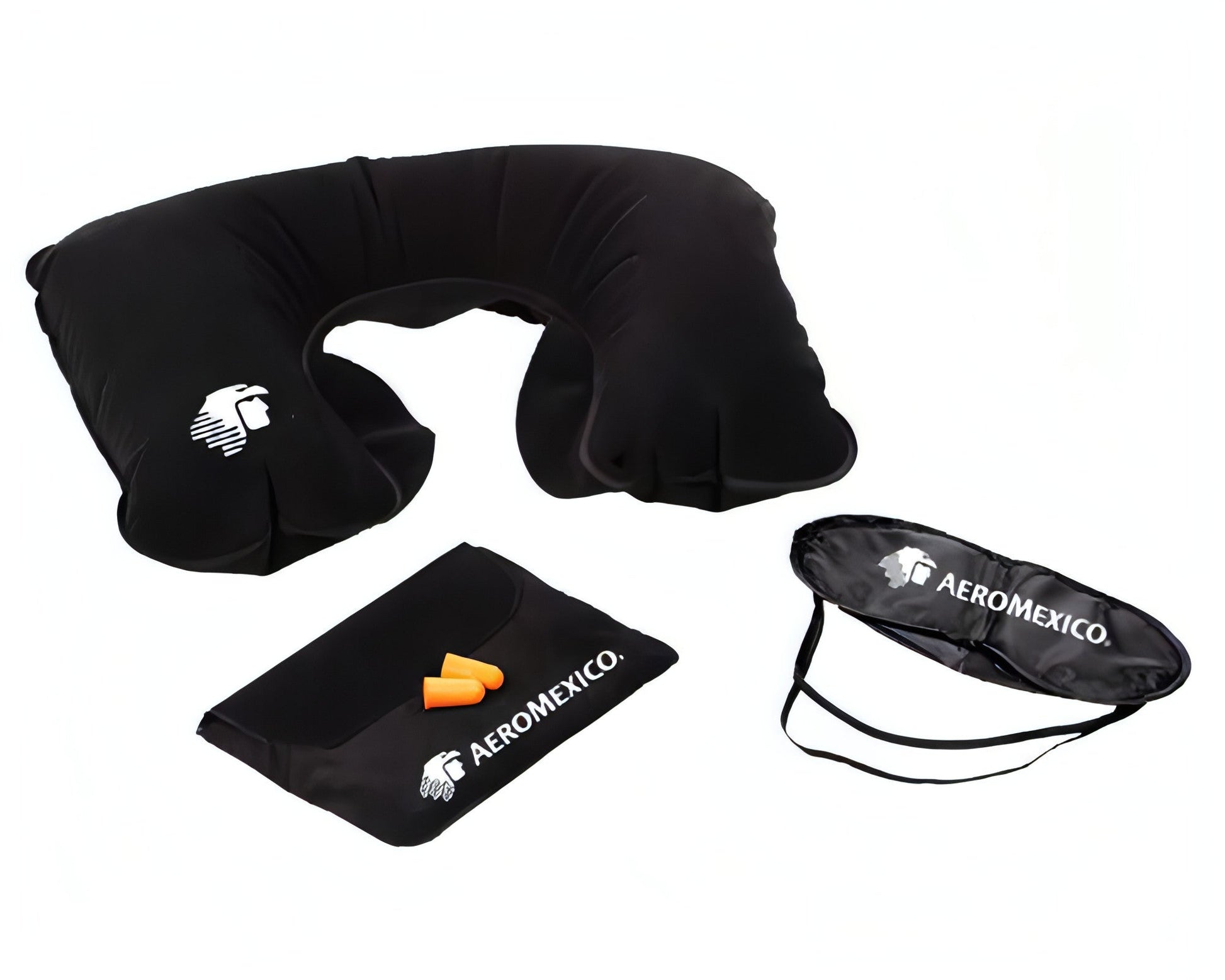 Kit de siesta para viaje. Incluye: Bolsa plástica con exterior de terciopelo, almohadilla inflable para sujetar alrededor del cuello, cubre ojos con cinta elástica y tapones personales reusables.