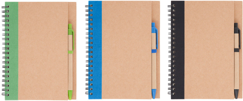 Libreta elaborada con papel reciclado. Incluye bolígrafo biodegradable. Cierre con goma elástica. Con espiral metálico. Contiene 70 hojas lisas.