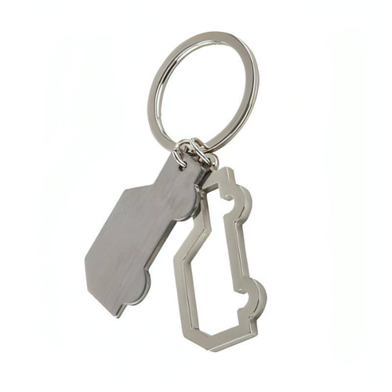 Llavero metálico doble en forma de coche, placa sólida y silueta, con arillo reforzado para colgar.