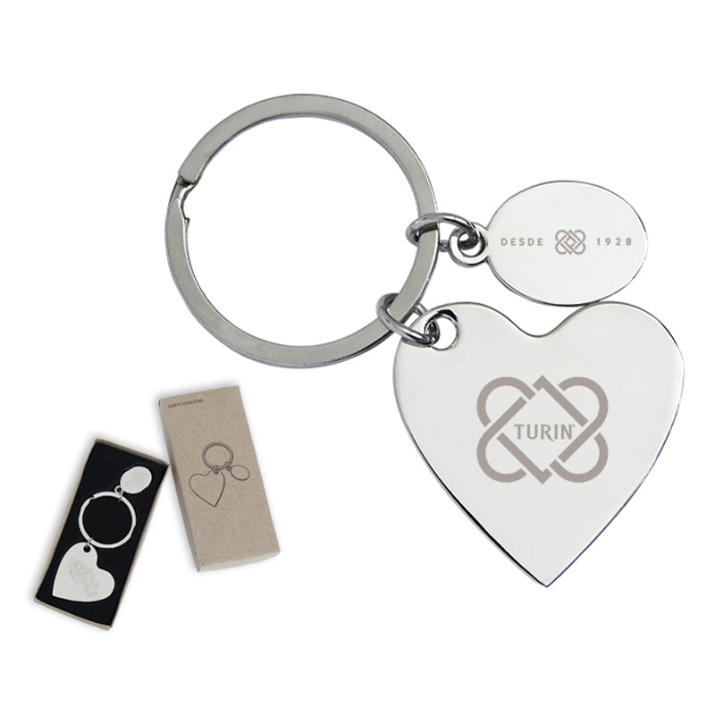 Llavero en forma de corazón con placa de aleación de zinc y arillo reforzado de hierro. Presentación: Caja individual de kraft.