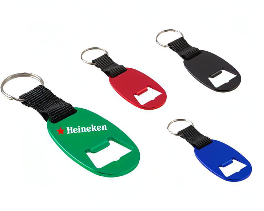 Llavero destapador en color metalizado con cinta y arillo para colgar.