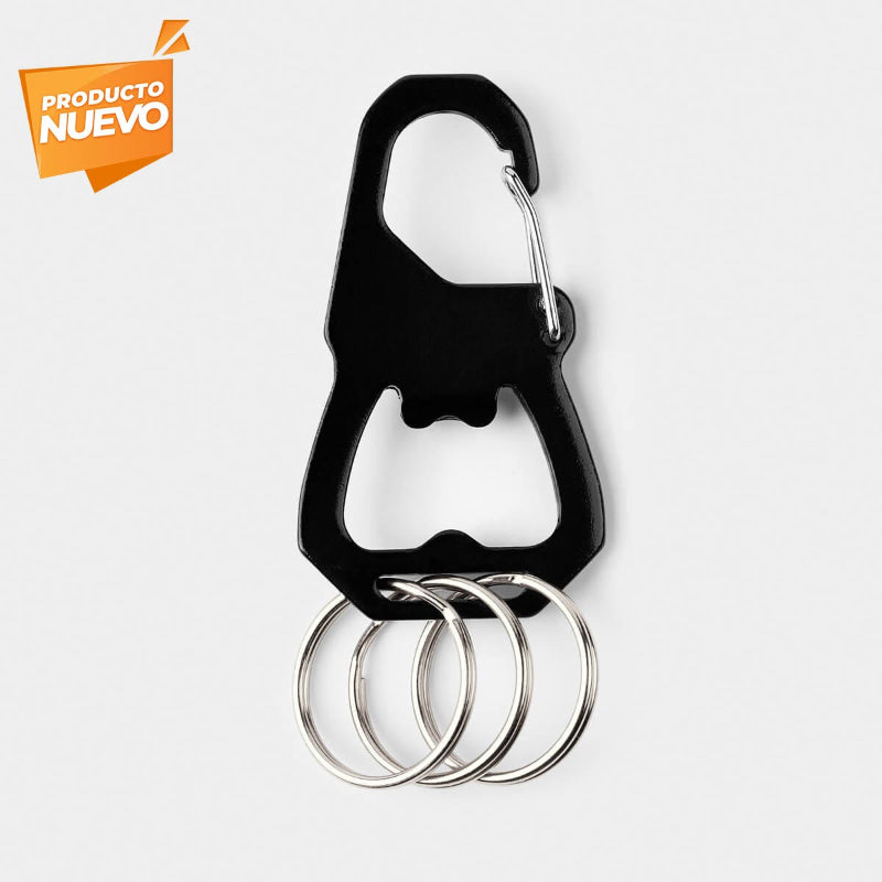 Llavero metálico multifunción con gancho, destapador y tres aros para llaves. Organiza y transporta tus llaves con un accesorio práctico y de uso diario.