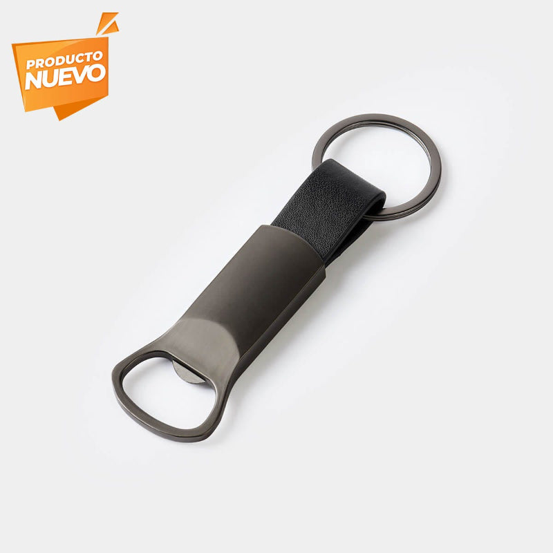Llavero destapador metálico con terminado mate. Detalle en curpiel que estiliza su diseño.