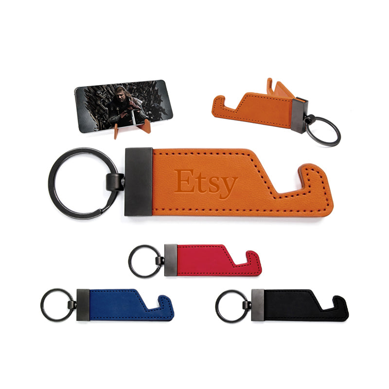 Llavero/soporte para dispositivos móviles de PU con imán para compactarlo y arillo metálico reforzado. Presentación: Caja individual de kraft.