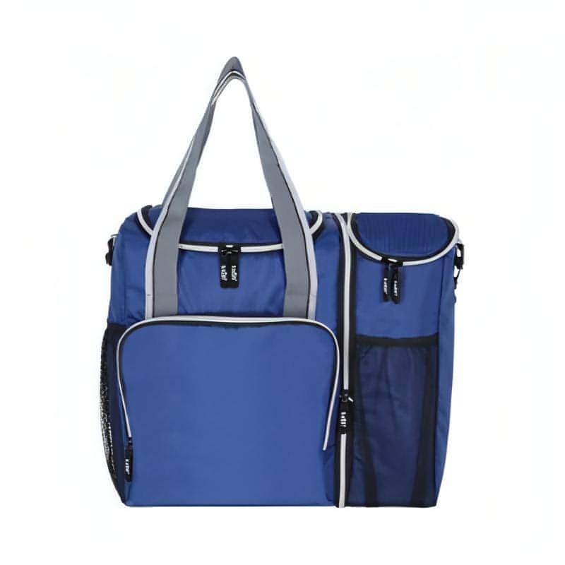 Lonchera incluye interior plastificado, dos compartimentos principales, malla frontal y lateral, correa ajustable.