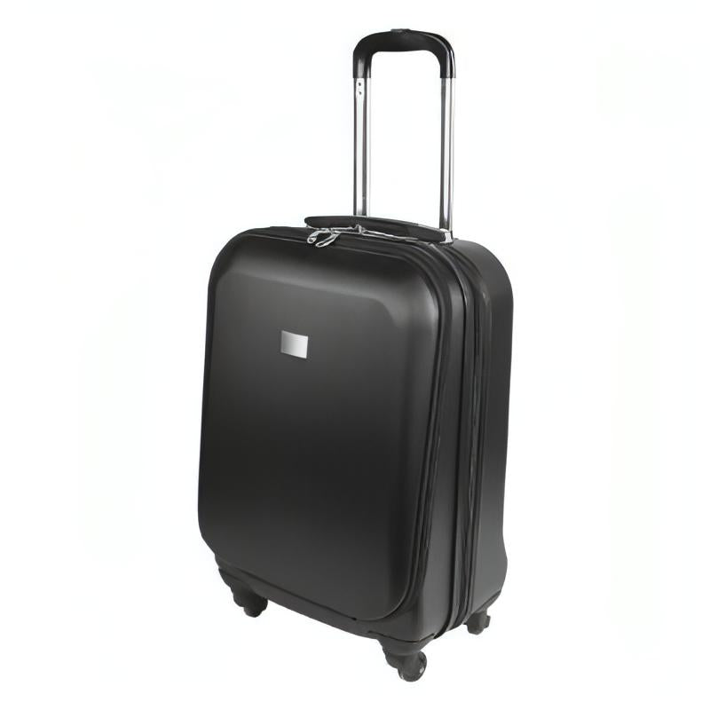 Maleta trolley 4 ruedas. Cierre frontal con espacio para laptop y organizador de documentos. Cierre principal con 2 compartimentos internos. Placa metálica removible para fácil grabado y candado de seguridad con combinación de 3 dígitos.