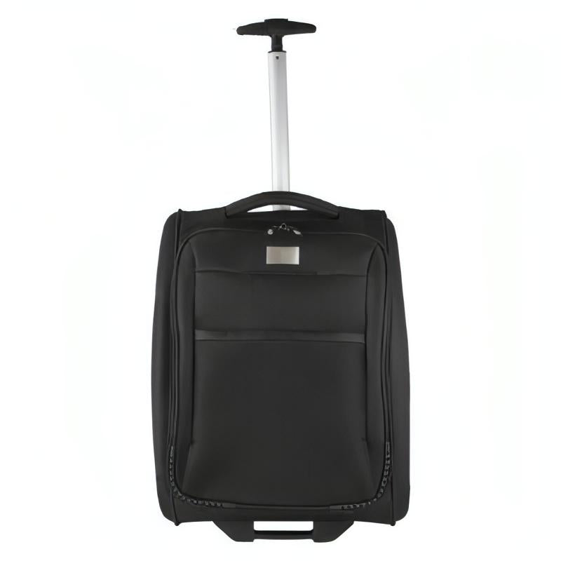 Maleta trolley dos ruedas. Compartimento principal y compartimento interno con bolsa de red con cierre. Bolsa frontal con cierre y placa removible para fácil grabado.