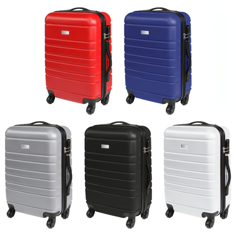 Maleta rígida de viaje con exterior fabricado en plástico ABS e interiores en poliéster, con mango retráctil de aluminio, 4 ruedas resistentes, 2 agarraderas para poder cargarla horizontal o verticalmente, chapa de seguridad con 3 dígitos de combinación y placa metálica para grabado.