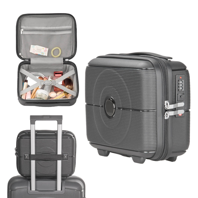 Maleta de viaje de plástico con compartimento principal con cierre, banda elástica, candado de seguridad, asa y banda carry-on.
