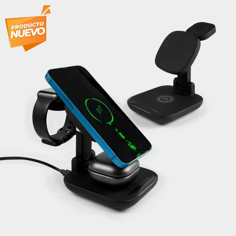 Cargador inalámbrico con triple función. Diseño plegable, el ángulo es ajustable, fácil de almacenar y permite la carga simultánea. Incluye estación de carga para smartphone, reloj inteligente y audífonos de carga rápida. Incluye cable de 1m con conector tipo C. Compatible con dispositivos que cuenten con tecnología de carga inalámbrica. Incluye caja individual.
