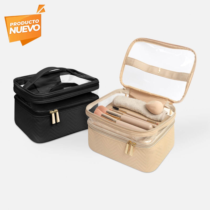 Neceser fabricado en PU con cuerpo semirrígido. Cuenta con dos niveles con cierre, ideales para organizar y separar productos de belleza o higiene personal. Su panel superior de mica transparente permite visualizar el contenido fácilmente, mientras que el asa facilita su transporte. Ideal para guardar productos de belleza, cuidado personal o maquillaje.