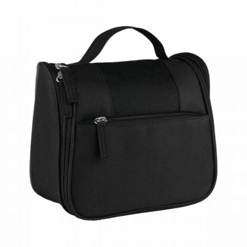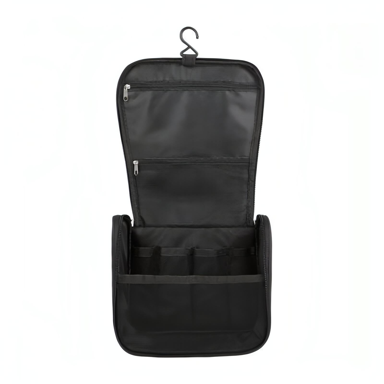 Bolsa con cierre y asa en el exterior. Incluye gancho, 2 compartimentos con cierre y 4 bolsas de malla en el interior.
