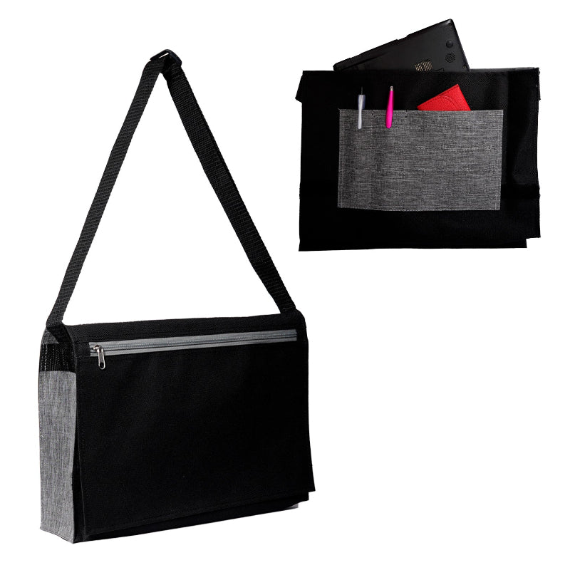 Portafolio con compartimento principal para laptop de hasta 15", organizador frontal, solapa con cierre de velcro, bolsa trasera con cierre y correa ajustable.