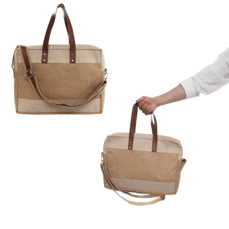 Portafolio de yute laminado con interior de algodón, 1 compartimento con broche de velcro para porta laptop, cierre, correa ajustable y asas.