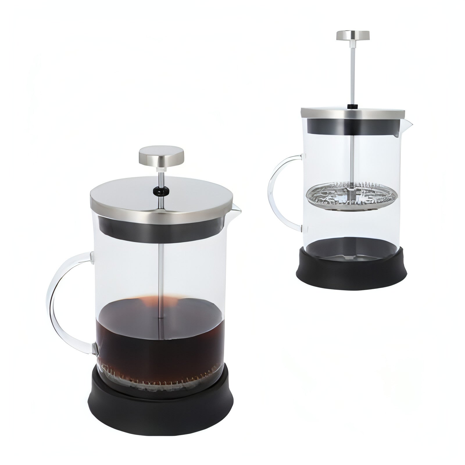 Prensa francesa con asa de vidrio, base plástica y tapa de acero inoxidable.