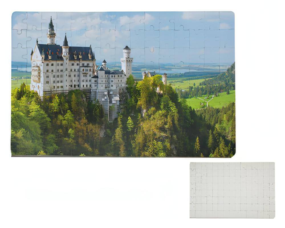 Superficie de cartón con recubrimiento blanco brillante y suaje de rompecabezas. No incluye base. Temperatura y Tiempo sugeridos para sublimar: 180 grados / 45 seg.