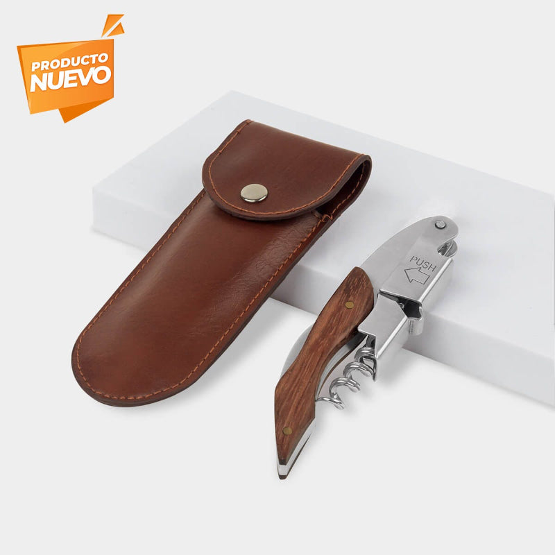 Sacacorchos de acero inoxidable. Ideal para los más aventureros. Cuenta con un mango de madera, mecanismo de doble bisagra, sacacorchos, detapador de botellas y cortador de lámina dentado. Incluye elegante funda de curpiel y caja individual.