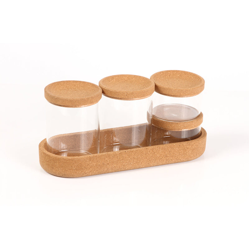 Set de contenedores fabricados en borosilicato (vidrio) con tapa de corcho, ideales para alimentos o artículos diversos. Incluye dos envases de 8x10 cm, dos envases de 8x4 cm y una base fabricada en corcho.