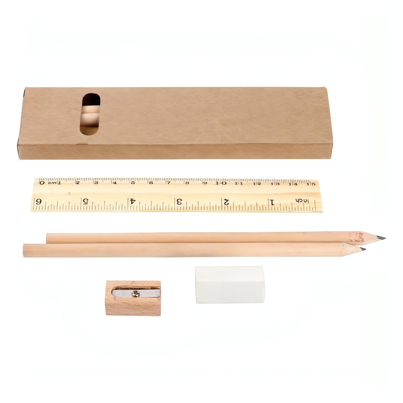 Set escolar ecológico con goma, 2 lápices, regla de madera con 15 cm y sacapuntas de madera.
