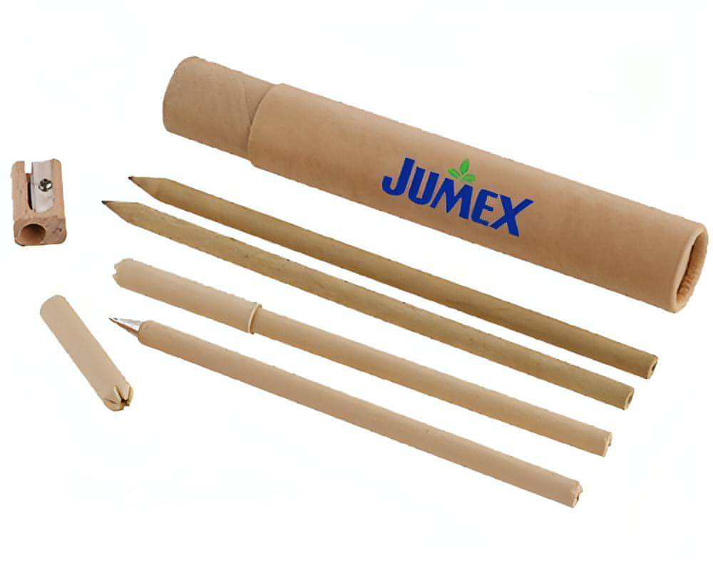 Estuche de escritura de papel reciclado con tapa. Incluye 2 lapices de madera, 2 plumas y un sacapuntas.
