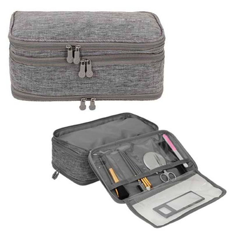 Set de viaje con 3 compartimentos, 4 organizadores elásticos, 5 organizadores de plástico de diferentes tamaños y asa.