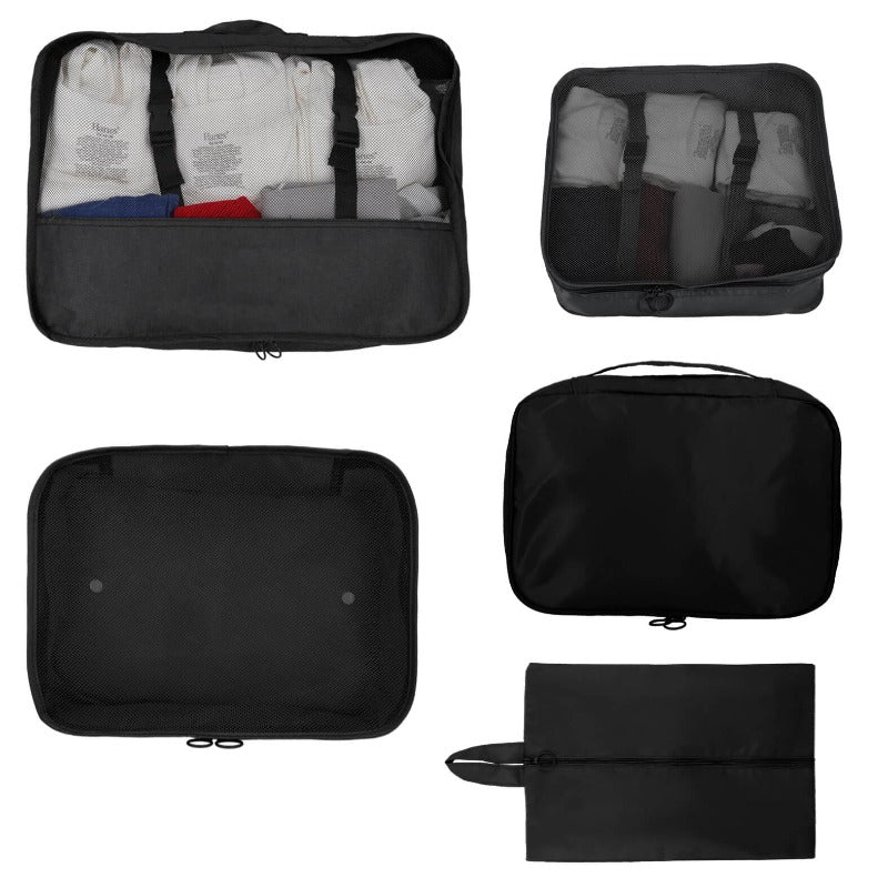 Set de 5 bolsas organizadoras de equipaje, que incluye: 4 bolsas de diferentes tamaños con asas y 1 zapatera.