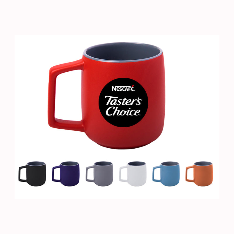 Taza acabado mate en el exterior, interior color gris con asa cuadrada. CAP. 415 ml. (14 OZ). Venta en múltiplos de 12.