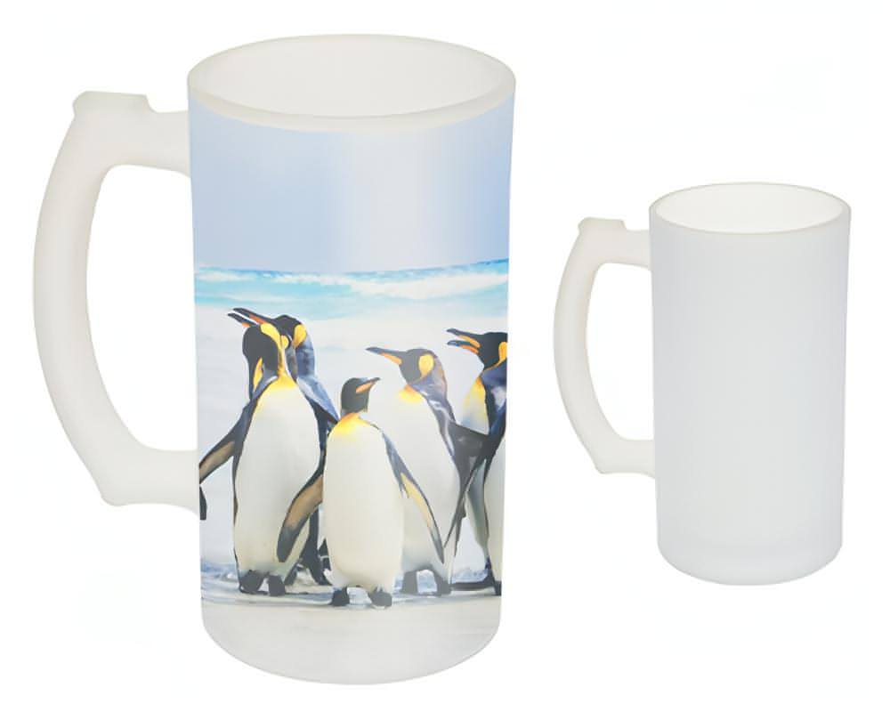 Tarro de vidrio satinado para cerveza. CAP. 450 ml. Temperatura y Tiempo sugeridos para sublimar: 190 grados / 120 seg.