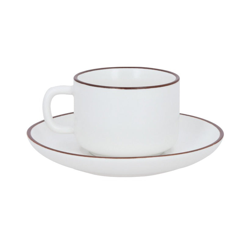 Taza y plato de cerámica con acabado mate.