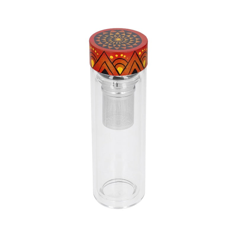 Termo con doble pared de vidrio, infusor de metal y tapa enroscable de bambú. EDICIÓN ALEBRIJE.