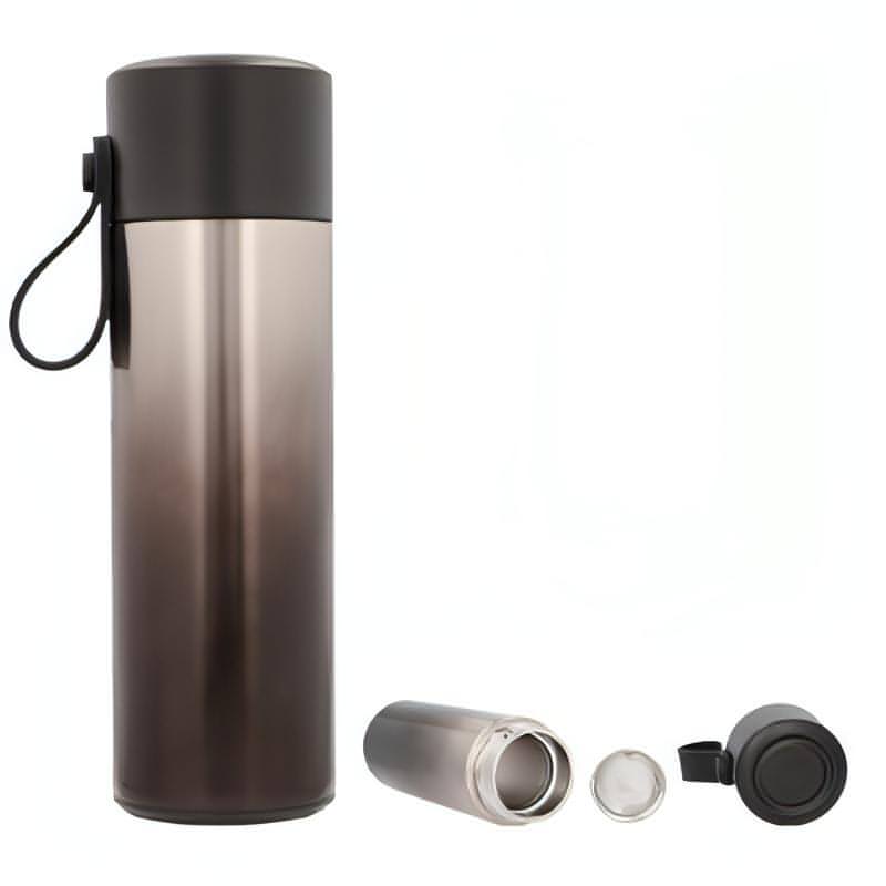 Termo difuminado con doble pared de acero inoxidable, colador metálico y tapa enroscable de plástico con correa de silicón.