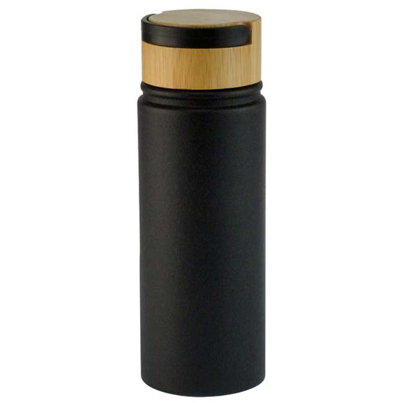 Termo con sistema de doble pared al vacío. Tapa de bamboo con cierre en rosca y correa para sujetar.