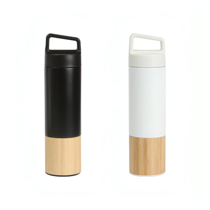 Termo de acero inoxidable doble pared con detalle de bambú en la parte baja. Fabricado en materiales de grado alimenticio, mantiene bebidas frías o calientes por un largo tiempo. No usar en microondas. Capacidad de 500 ml. Incluye caja de cartón individual.