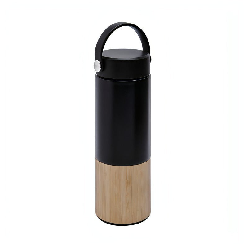 Termo doble pared con base de bambú. Cerrado al vacío. Pared interna y externa de acero inoxidable. Tapa de plástico con asa de silicón y cierre de rosca. Incluye caja individual.